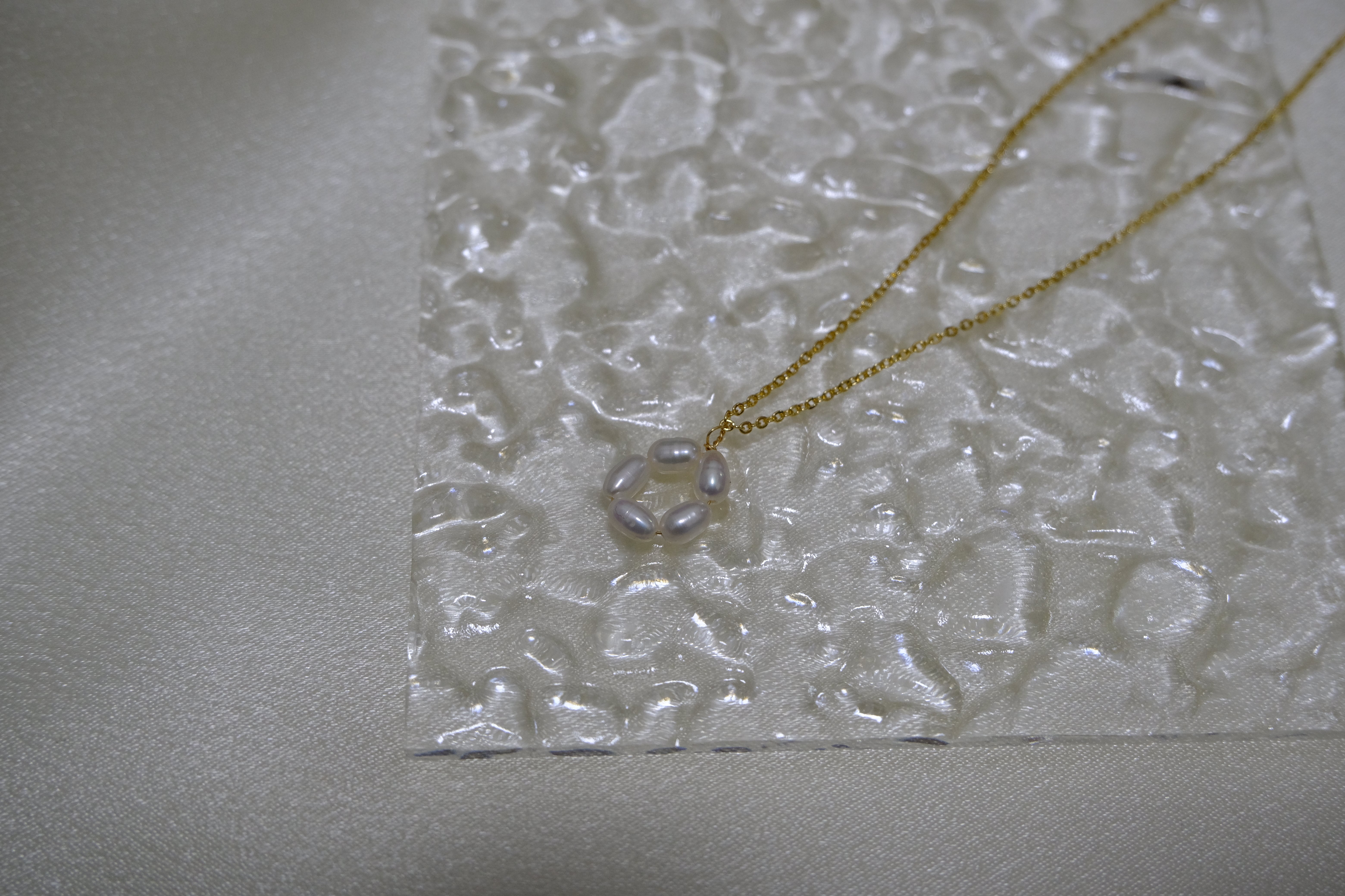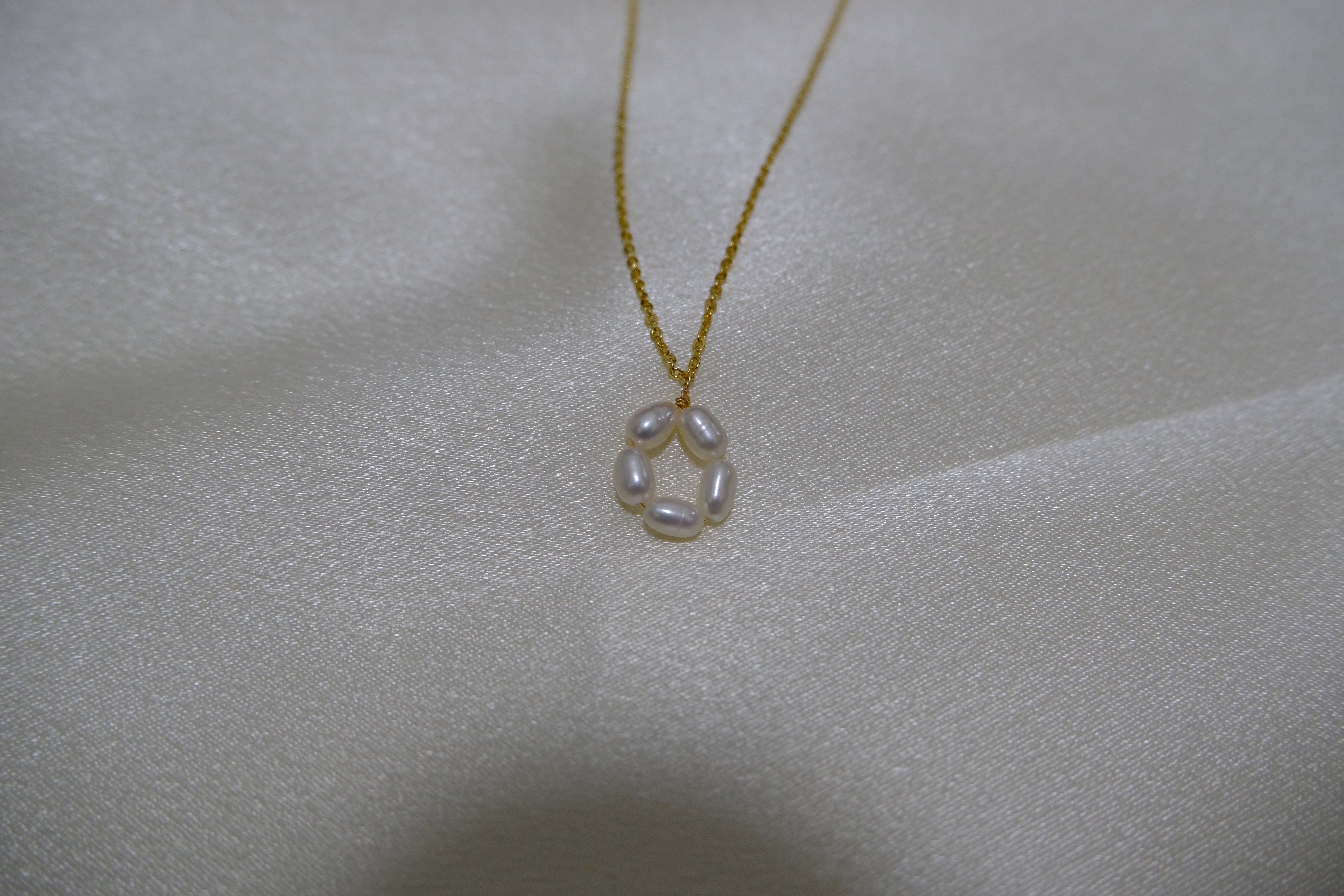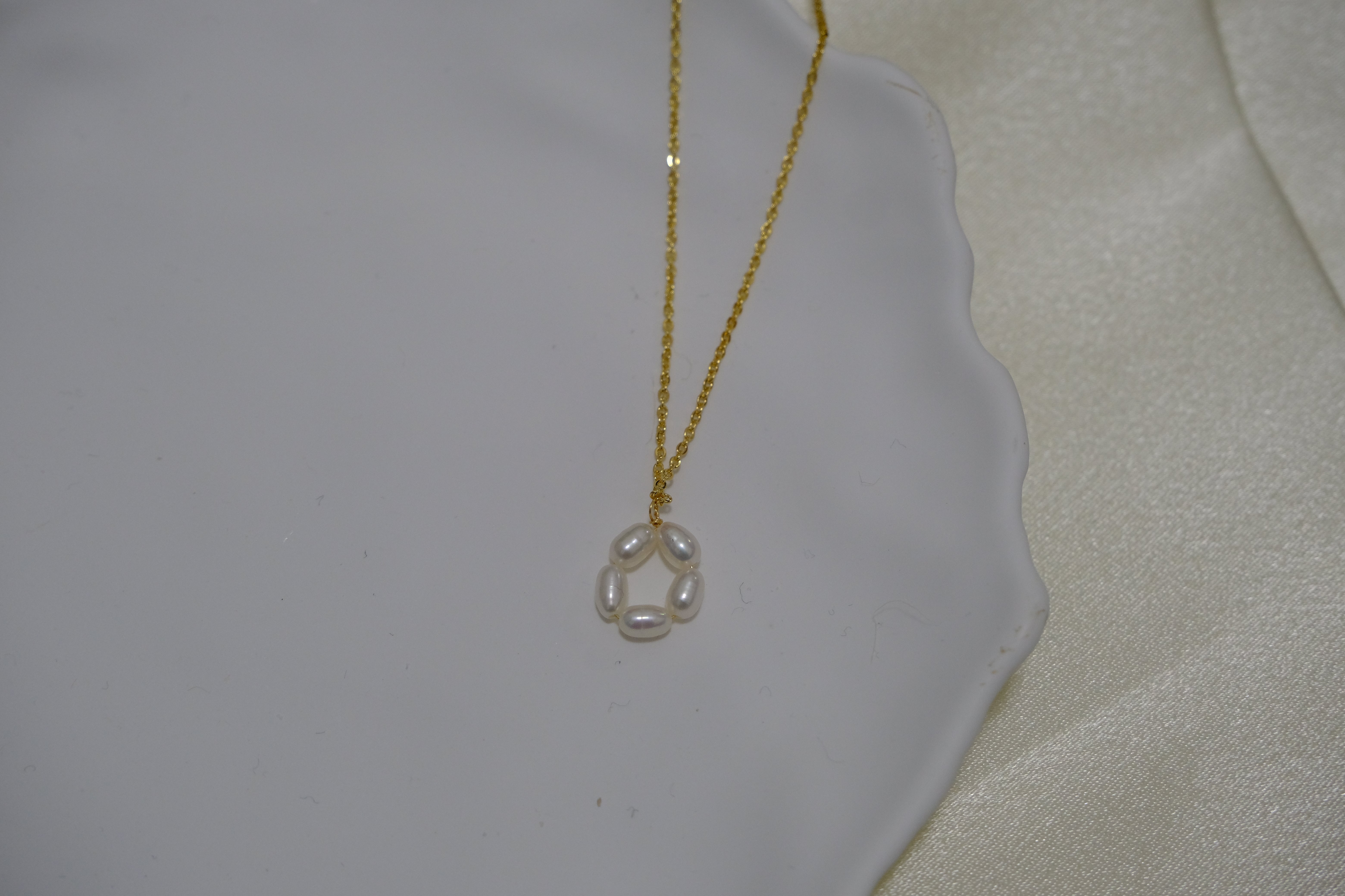 A gold-plated necklace features a pendant of five freshwater pearls arranged in a flower shape.