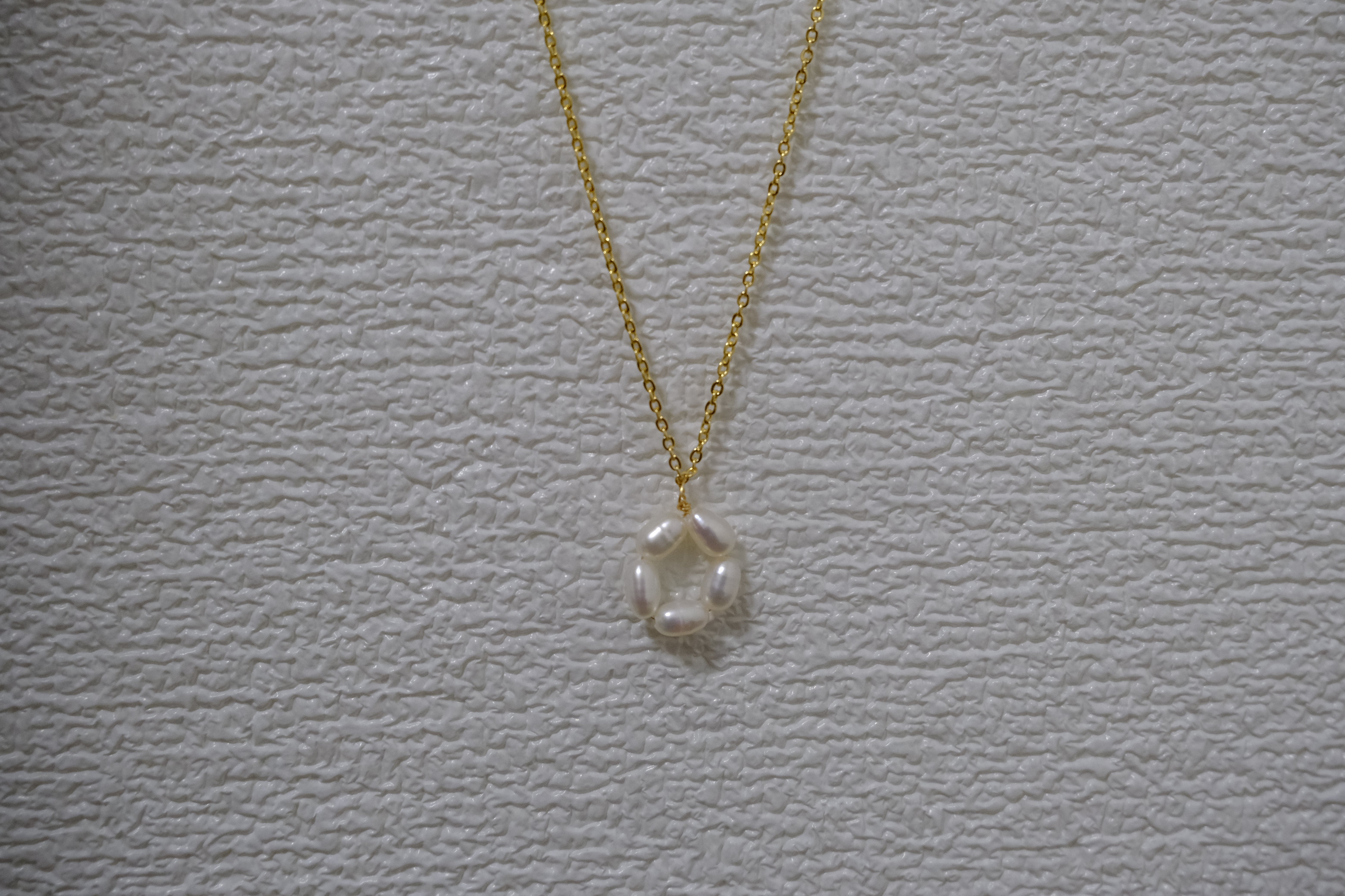 Gold-plated necklace with a pendant of five freshwater pearls arranged in a flower shape.