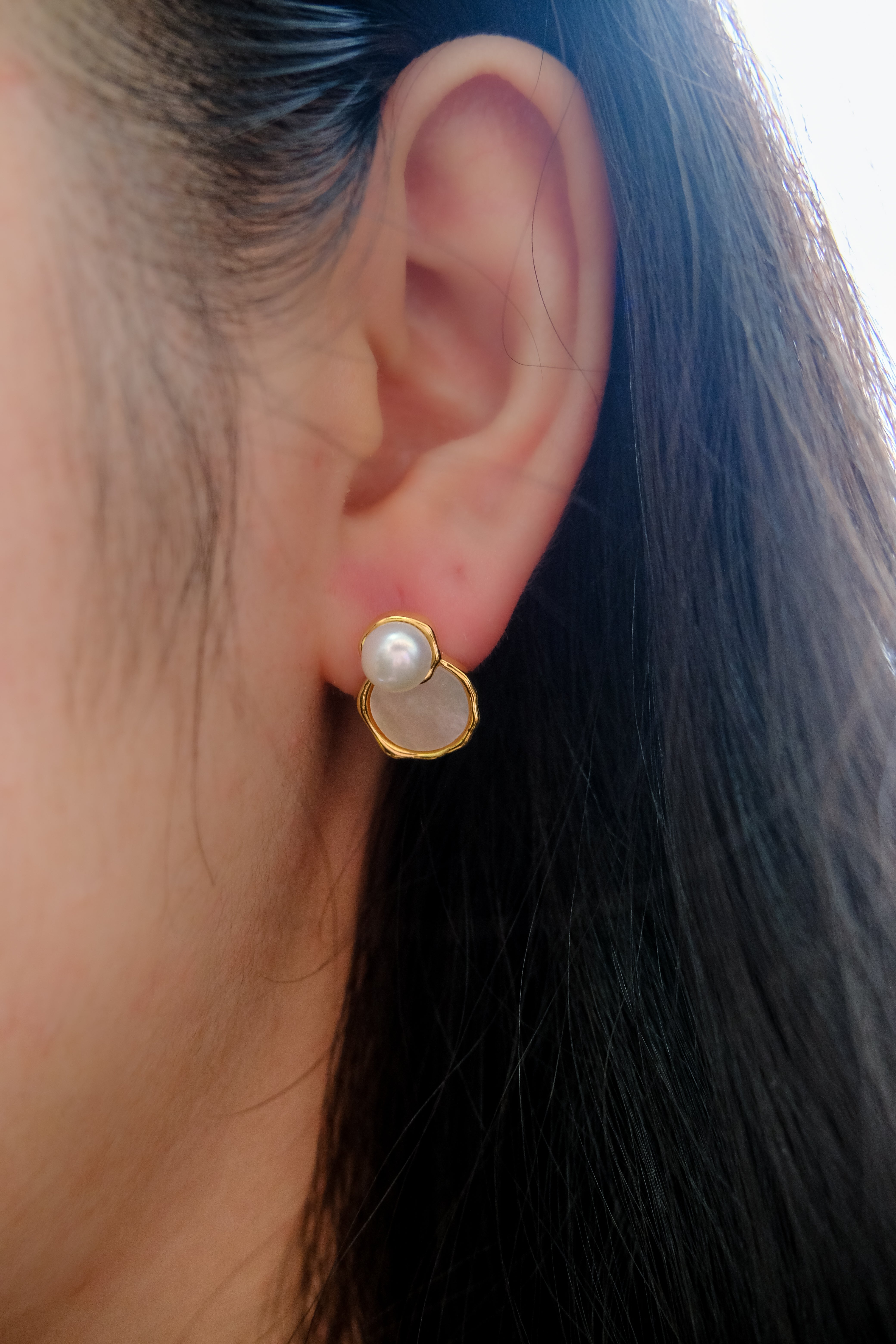 A close-up of a woman's ear wearing a gold earring with a pearl and a white stone.