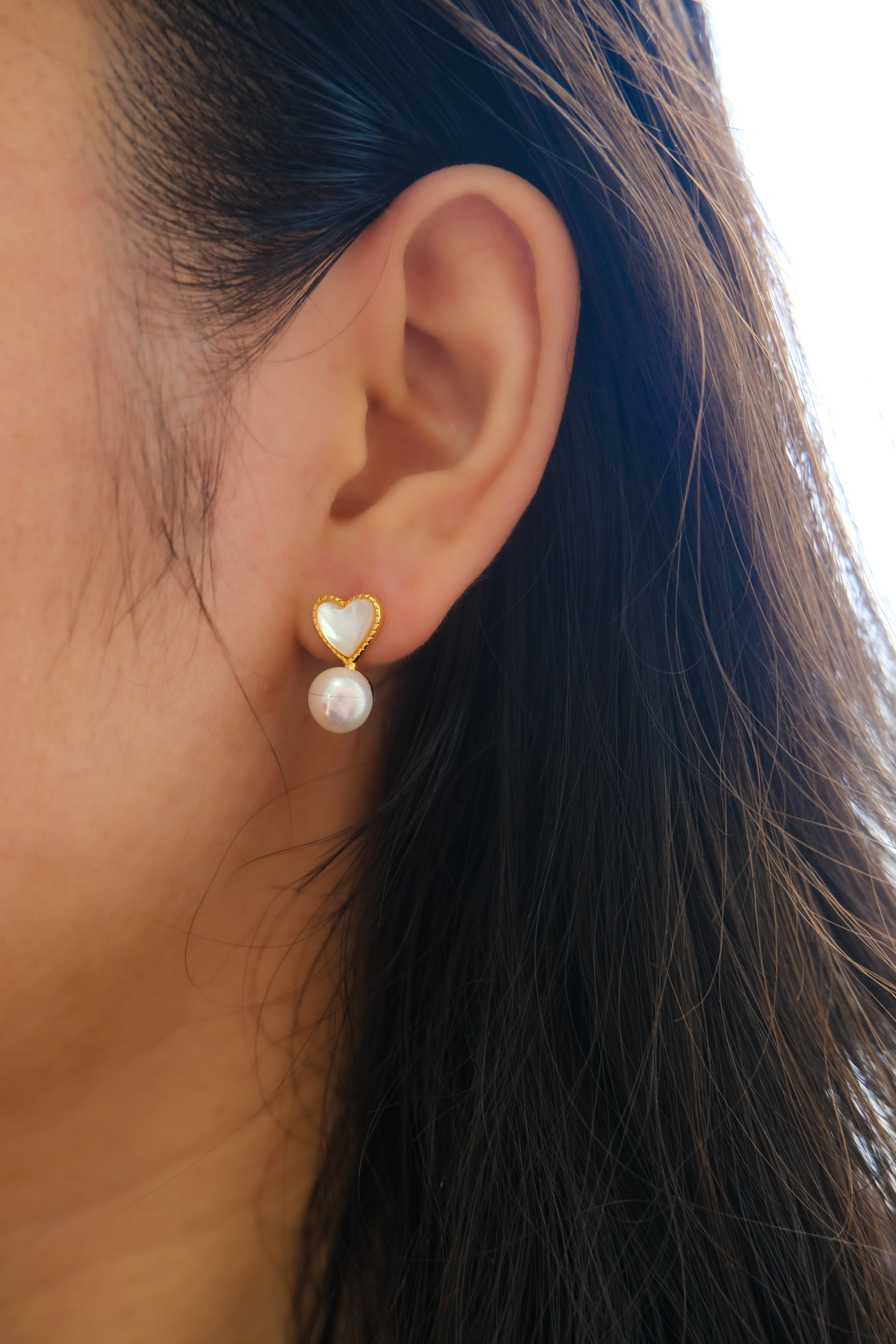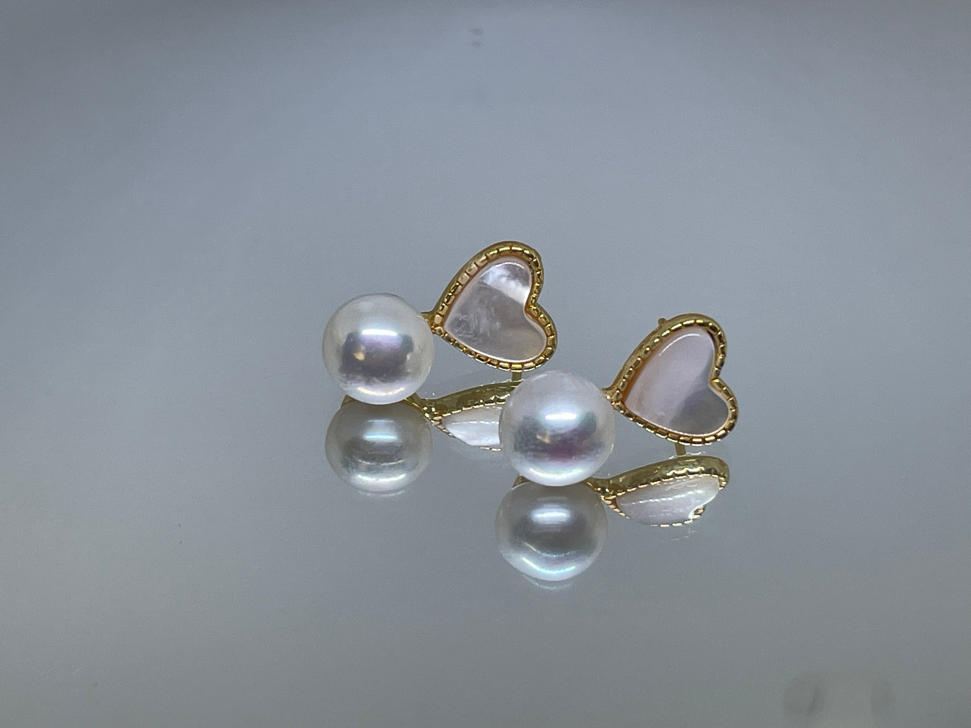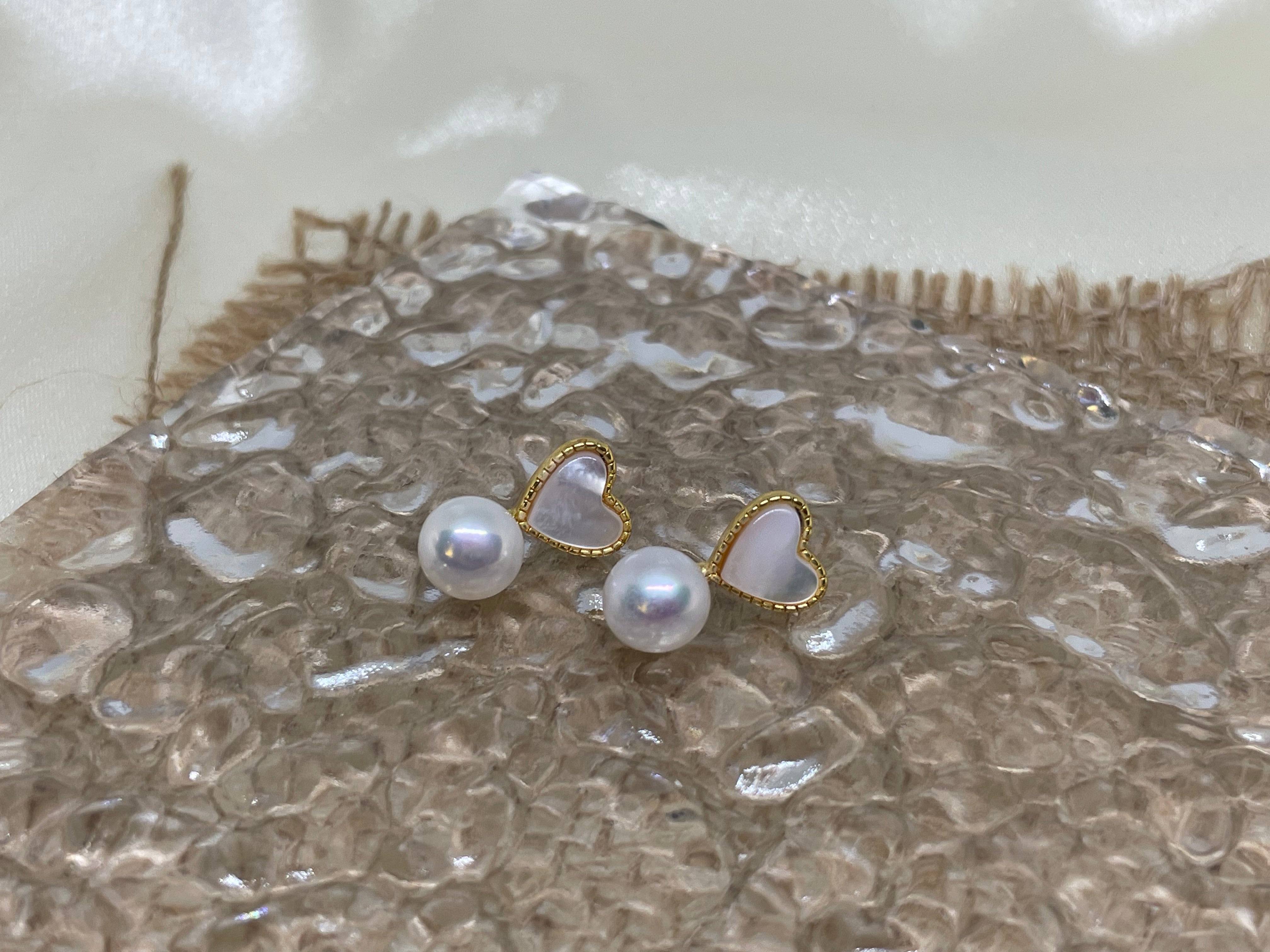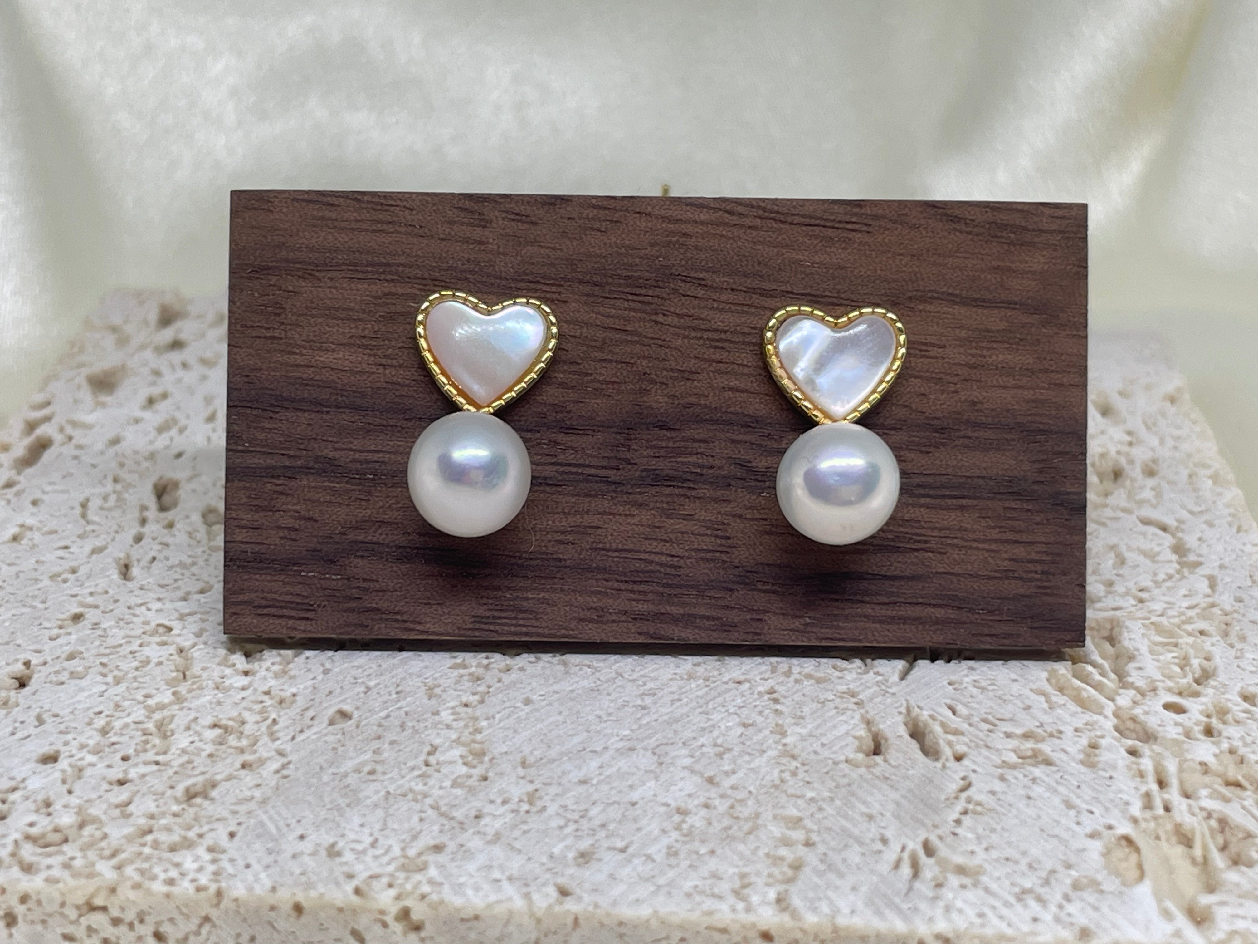 These exquisite stud earrings feature a delicate heart-shaped design crafted from luminous white Fritillaria shell, radiating a soft, iridescent glow. Suspended gracefully beneath the heart is a lustrous round freshwater pearl, adding a touch of timeless elegance. The combination of the shimmering mother-of-pearl heart and the smooth, radiant pearl creates a harmonious blend of sophistication and charm. Perfect for both casual and formal occasions, these earrings are a beautiful symbol of love and refinement, making them an ideal gift or a stunning addition to your jewelry collection.